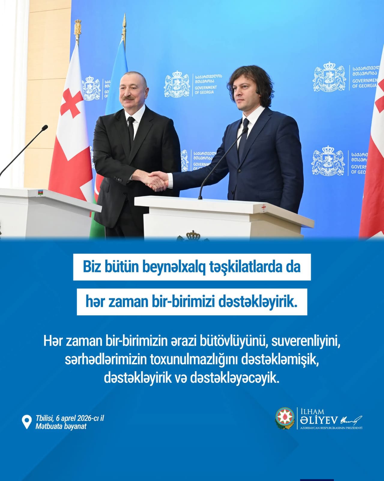 2026-cı il aprelin 6-da Azərbaycan Respublikasının Prezidenti İlham Əliyev Gürcüstana rəsmi səfəri çərçivəsində mətbuata verdiyi bəyanatda iki ölkə arasında mövcud olan strateji tərəfdaşlığın və dostluq münasibətlərinin yüksək səviyyədə olduğunu bir daha vurğulayıb. Bu səfər iqtisadi əməkdaşlığın daha da dərinləşdirilməsi baxımından mühüm əhəmiyyət kəsb edir.