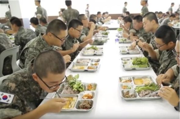 Cənubi Koreyada əsgərlərə toyuqlu düyü, lobya, donuz əti kolbasaları, küftələr, qurudulmuş ədviyyatlı tərəvəz bulyonu verilir. Koreyanın dəniz piyadaları potensial təhlükələrə hazır olmaq üçün hərbi təlimlər zamanı heç bir qatqıya və isitməyə ehtiyacı olmayan hazır yeməklərlə qidalanırlar. Bu ölkənin ordusunda milli yemək kimi düyü və ət tərkibli “bibimbap”dan da istifadə edilir. 2020-ci ildə ordu əsgərlərin tezliklə veqan yeməkləri yeyə biləcəklərini bəyan edib. Yeni menyuya “tofu”, tərəvəzlər, salatlar və vegetarian “bibimbap” da daxil edilib.
