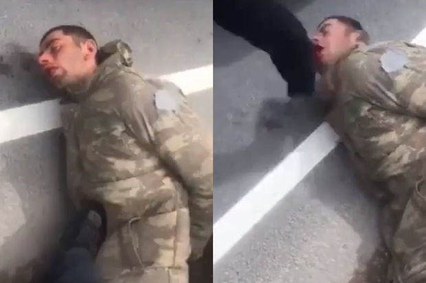 Kadrlardan görünür ki, ermənilər azərbaycanlı hərbçinin əlini-qolunu bağlayaraq onu vəhşicəsinə döyürlər.