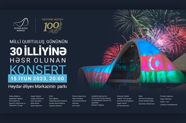 Bu il Azərbaycanda iki əlamətdar tarix – ümummilli lider Heydər Əliyevin 100 illik yubileyi və ulu öndərin hakimiyyətə qayıdışının 30 illiyi qeyd edilir. Bu münasibətlə 15 iyun – Milli Qurtuluş Günündə Heydər Əliyev Mərkəzinin parkında konsert proqramı təqdim ediləcək.