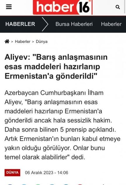 “Haber 16” saytı isə “Əliyev: Sülh müqaviləsinin prinsipləri tərtib edilib Ermənistana göndərilib” başlıqlı yazıda Prezident İlham Əliyevin çıxışından belə bir sitat gətirib: “Beş məlum prinsip açıqlandı. İndi görünür ki, Ermənistan bunları qəbul etməyə yaxındır. Onlar bunu baza kimi götürə bilərlər. Bunu bir neçə il əvvəl etsəydilər, əlbəttə ki, antiterror əməliyyatına ehtiyac qalmazdı. Bu, tarixdir və onu göstərir ki, sülhü təşviq edən tərəf məhz Azərbaycan idi, Ermənistan deyil”.