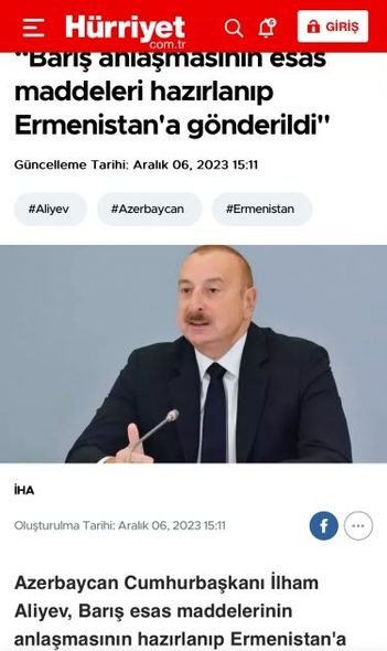 “Hurriyet.com” saytının “Sülh anlaşmasının əsas maddələri hazırlanıb Ermənistana göndərildi” sərlövhəli yazısında da Prezident İlham Əliyevin fikirləri əks olunub. Yazıda dövlətimizin başçısının fikirlərinə istinadla bildirilib ki, Azərbaycan iki il yarım bundan əvvəl suverenliyini bərpa etdikdə, Qarabağda böyük həcmdə çoxsaylı erməni kontingenti vardı və onlar heç bir beynəlxalq hüququn prinsiplərinə məhəl qoymurdular. Daha sonra Prezident İlham Əliyevin bu fikirlərindən sitat gətirilib: “Biz ümid edirdik ki, bu məsələ öz həllini tapacaq. Biz dərk edirdik ki, bu, anormal vəziyyətdir və İkinci Qarabağ müharibəsi bitəndən sonra bizim mövqeyimiz aydın idi. Qarabağda yaşayan insanların iki seçimi var – onlar ya Azərbaycan vətəndaşları olurlar və onların bütün hüquqi çərçivələri yaradılır və ya yaşayış üçün digər yerləri seçirlər. Bunun başqa yolu yox idi”.