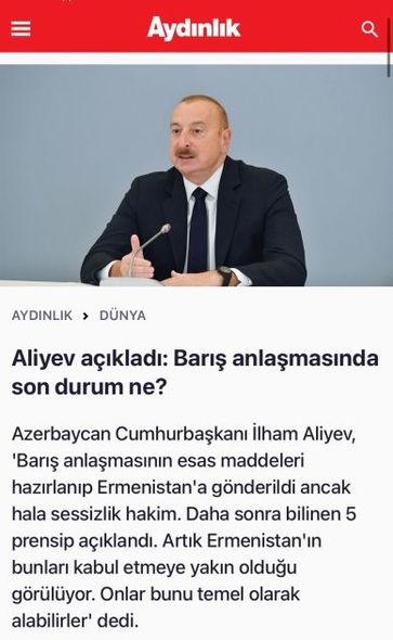 “Aydınlık” saytının “Əliyev açıqladı: Sülh sazişində son vəziyyət necədir?” başlıqlı məqaləsi isə “Bölgəyə sülhü gətirdik”, “Ermənilər üçün lazımi şərtlər yaradılır”, “Ermənistana əlimiz uzatdıq” kimi yarımbaşlıqlarla verilib. Yazıda Prezident İlham Əliyevin “Ermənistanın hazırda iki variantı var. Birincisi, öz xərcləri, yaxud da Avropa fondlarının pulu ilə dərhal 42 kilometrlik məsafədə dəmir yolu çəksinlər. Biz bunu, əslində, onların suveren ərazisi hesab edirik və suverenliklə bağlı bizim şərtimiz yoxdur. Lakin Azərbaycandan Naxçıvana asan çıxış olmalıdır. Bununla bağlı hansısa gömrük yığımı, yoxlamalar, sərhədçilərin prosedurları olmalı deyil. Bu, bizim legitim hüququmuzdur” – kimi fikirləri geniş yer alıb.