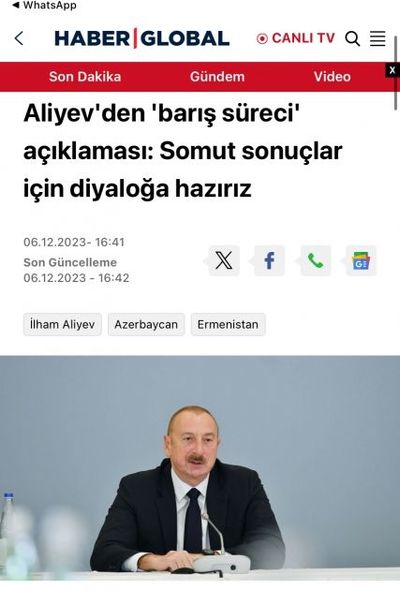 “Haber Global” media qurumunun “Əliyevdən sülh prosesi açıqlaması: Konkret nəticələr üçün dialoqa hazırıq” sərlövhəli geniş yazısı “Ermənistan bölgədə nəqliyyat dəhlizlərinin dirçəldilməsindən yayınır”, “Qarabağı tərk edən ermənilər evlərinə qayıda bilərlər” kimi yarımbaşlıqlarla verilib.