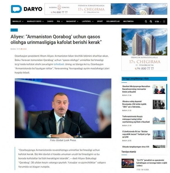 Özbəkistanın “Daryo” portalı isə yazır ki, Prezident İlham Əliyev forumdakı çıxışında Azərbaycan ilə Ermənistan arasında danışıqların ikitərəfli olmasının vacibliyinə bir daha diqqəti yönəldib.