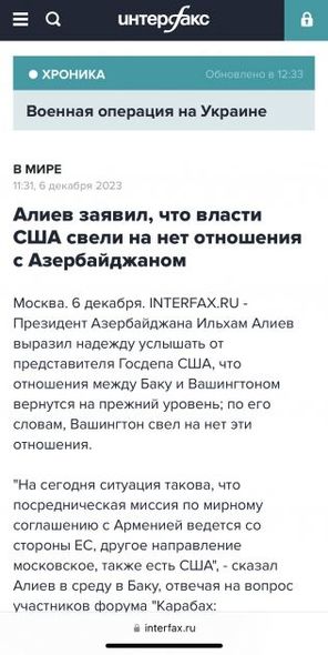 “İnterfaks” agentliyi xəbər lentində Azərbaycan Liderinin ABŞ-ın ikitərəfli münasibətləri heçə endirməsi, bununla da Azərbaycanla Ermənistan arasında münasibətlərin nizamlanması prosesindən uzaqlaşması ilə əlaqədar bəyanatına ətraflı yer ayırıb.