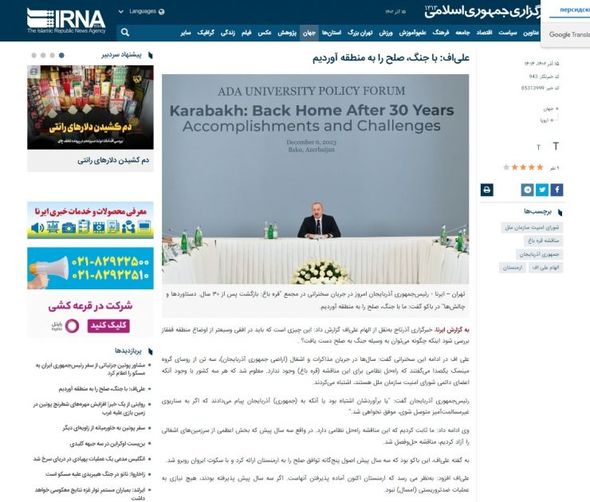 İRNA-nın AZƏRTAC-a istinadla dərc etdiyi materialda Prezident İlham Əliyevin “Biz regiona sülhü artıq gətirmişik. Biz onu müharibə yolu ilə etmişik. Məncə, buna daha geniş diqqət yetirilməlidir. Bu, təkcə Qafqazla bağlı deyil. Sülhə hərbi yolla necə nail olmaq olar, biz bunu nümayiş etdirdik” sözləri işıqlandırılıb. Dövlətimizin başçısının ATƏT-in keçmiş Minsk qrupunun fəaliyyətsizliyi ilə bağlı, həmçinin Azərbaycanın həyata keçirdiyi antiterror tədbirləri ilə əlaqədar fikirlərinin də əks olunduğu yazıda, Ermənistanla aparılan sülh danışıqlarının son vəziyyəti ilə bağlı fikirləri dərc edilib.