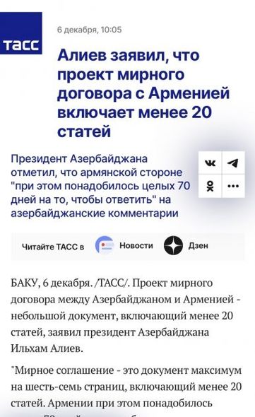 “TASS” Agentliyi Prezident İlham Əliyevin çıxışına istinadla yazır ki, Azərbaycanın xarici siyasət konsepsiyasında Avropa İttifaqına daxil olmaq məqsədi yoxdur, Azərbaycan dövləti əlaqələr qurmağın yollarını tapıb. Agentlik Azərbaycanın dövlət başçısının Ermənistanın sülh müqaviləsinin hazırlanmasına etinasız yanaşması, 6-7 səhifəlik sənədlə əlaqədar Azərbaycan tərəfinin şərhlərinə 70 günə cavab verməsi barədə dediklərini də oxucuların diqqətinə çatdırıb.
