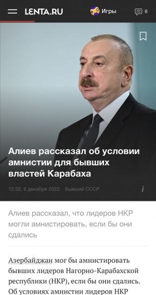“Lenta.ru” nəşri yazır ki, Prezident İlham Əliyev keçmiş separatçı rejimin başçılarının əfv olması şərtini açıqlayıb. Azərbaycan dövlətinin başçısı vurğulayıb ki, onlar təslim olsaydılar, əfv edilərdilər. Əvəzində isə onlar Bakıya tanklarda daxil olacaqlarını deyirdilər, indi isə məhkəmənin qərarını gözləyirlər.