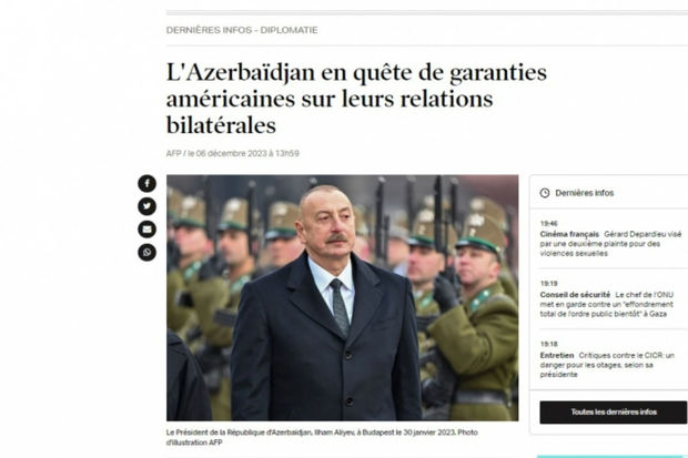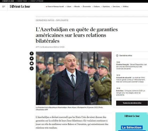 Fransanın “Lorientlejour” portalında dərc olunmuş məqalədə Prezident İlham Əliyevin fikirlərində istinadla bildirilib ki, Birləşmiş Ştatlar çox gərgin münasibətlərə malik Azərbaycan ilə Ermənistan arasında vasitəçilik rolunu oynamağa davam etmək istəyirsə, ikitərəfli əlaqələrin möhkəmliyinə zəmanət verməlidir.