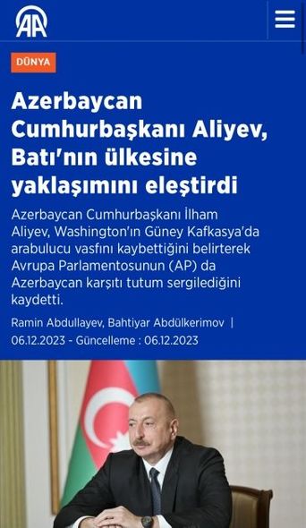 Anadolu Agentliyinin “Azərbaycan Prezidenti Əliyev Qərbin ölkəsinə münasibətini tənqid etdi” başlıqlı yazısında Prezidentimizin çıxışına geniş yer verib. Yazıda dövlətimizin başçısının “Fransa və Hindistan Ermənistanı silahlandırmaqla, necə deyərlər, tonqala yanacaq tökürlər və Ermənistanda qeyri-real fikir formalaşdırırlar”, “Ermənistan fikirləşə bilər ki, həmin silahları istifadə etməklə yenidən Qarabağı işğal edə bilər. Mən hələ o silahların keyfiyyəti haqqında danışmıram. Ən müasir silahları olsa belə, bu, mümkün deyil. Çünki müharibənin nəticəsi insanlar və onların ruhu sayəsində həll edilir. Hətta İkinci Qarabağ müharibəsindən sonra Ermənistan özü bəyan etdi ki, müharibə zamanı onların 12 min dezertiri, fərarisi olub. Yəni, onlar Azərbaycan qarşısında tab gətirə bilməzlər” sitatları yer alıb.