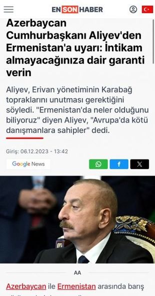 “Ermənistan hökuməti xaotik olaraq bir qütbdən digər qütbə gedir. Onlar hesab edirlər ki, bununla xilas olunacaqlar. Bu, belə deyil. Onlar, sadəcə, digər böyük qardaşı qazanacaqlar. Bu böyük qardaş əvvəlki qardaşdan yaxşı olacaq? Səmimi olaraq deyək ki, bu, belə deyil. O uzaqdadır, bölgəyə o qədər də bağlı olan qardaş deyil və özünün siyasi, bəlkə də şəxsi ambisiyalarının, ideyalarının dalınca gedir. Ən azı Ermənistan öz tərəfindən iradəsini bildirməlidir. Bu, sülh üçün ilk şərtdir”. Prezident İlham Əliyevin bu fikirləri isə “En son haber” saytında işıqlandırılıb.
