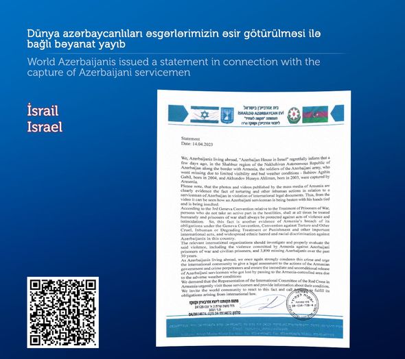 “İsraildə Azərbaycan Evi” diaspor təşkilatının adından beynəlxalq qurumlara ünvanlanan bəyanatda Azərbaycan Ordusu əsgərlərinin – 2004-cü il təvəllüdlü Bəbirov Aqşin Qabil oğlunun və 2003-cü il təvəllüdlü Axundov Hüseyn Əhliman oğlunun Ermənistana hansı şəraitdə əsir düşmələrinə aydınlıq gətirilib. Azərbaycanlı hərbçilərə qarşı törədilmiş qeyri-insani hərəkətlərə diqqət cəlb edilib, bu cinayətkar insident beynəlxalq humanitar qanunların Ermənistan tərəfindən kobudcasına pozulması kimi qiymətləndirilib.