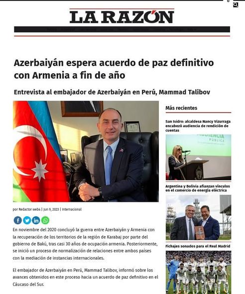 Perunun geniş oxucu auditoriyası olan “La Razon” qəzetində bu ölkədəki səfirimiz Məmməd Talıbovun Ermənistanın sülh prosesində yaratdığı maneələrdən bəhs edən müsahibəsi dərc olunub.