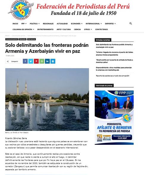 Peru Jurnalistləri Federasiyasının rəsmi portalında qurumun vitse-prezidenti, tanınmış perulu jurnalist Rikardo Sançesin “Yalnız sərhədləri delimitasiya etməklə Ermənistan və Azərbaycan sülh içində yaşaya bilərlər” sərlövhəli məqaləsi dərc edilib.