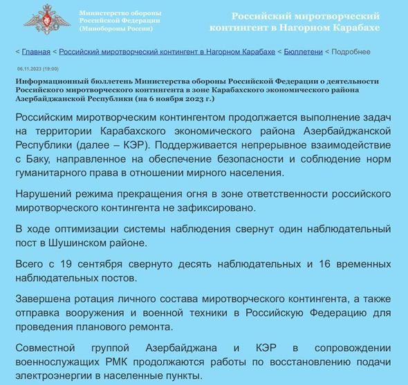 Nazirlikdən bildirilib ki, Rusiya sülhməramlı kontingenti Azərbaycan Respublikasının Qarabağ iqtisadi rayonunda tapşırıqların icrasını davam etdirir.